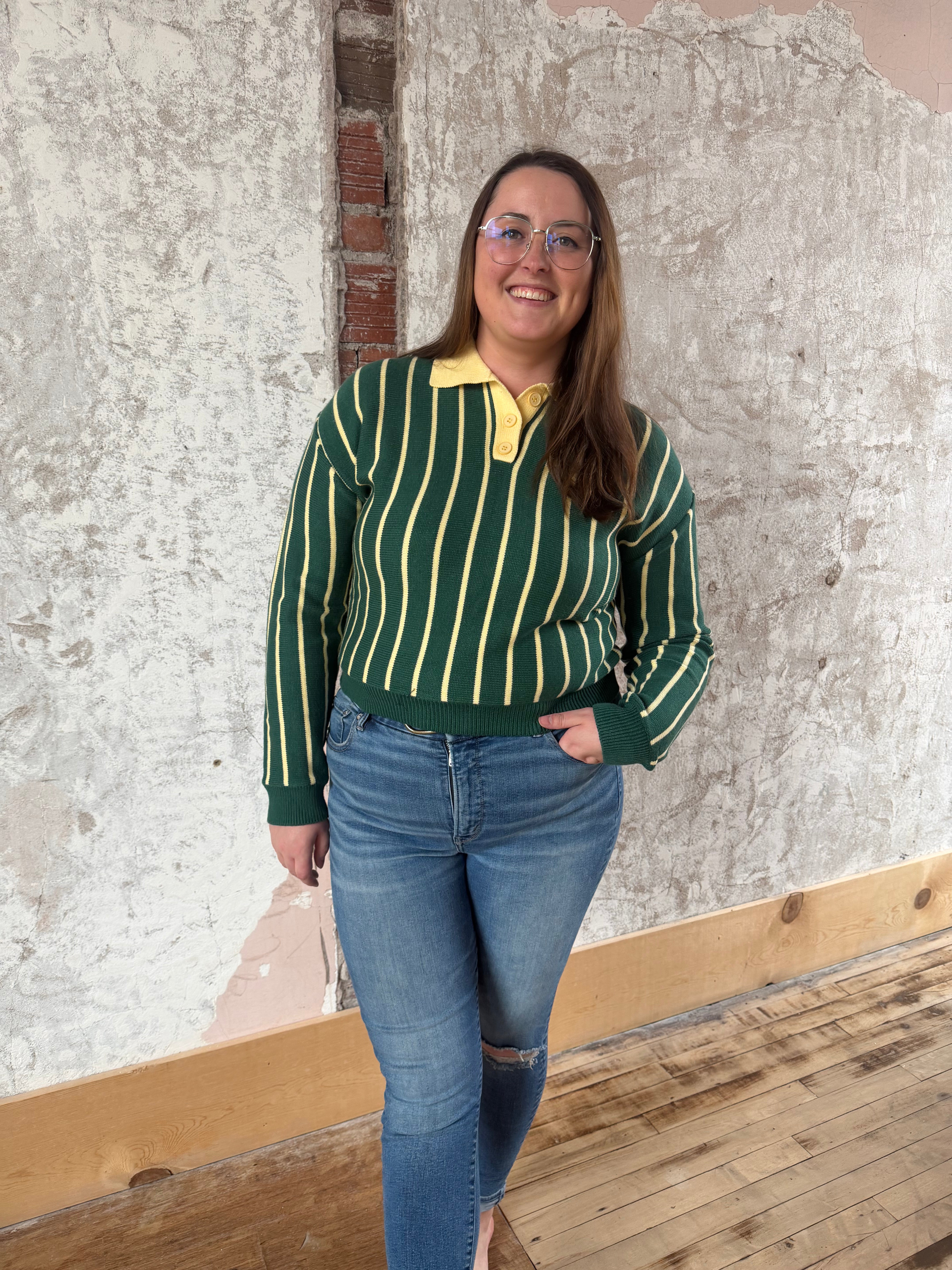 Channel preppy-chic vibes in this green and cream striped polo sweater with contrasting yellow collar and button placket. The relaxed fit and soft knit fabric offer all-day comfort, while ribbed cuffs and hem add classic detailing. Perfect for layering or wearing solo with tailored shorts. A versatile piece that effortlessly bridges casual and polished styling.