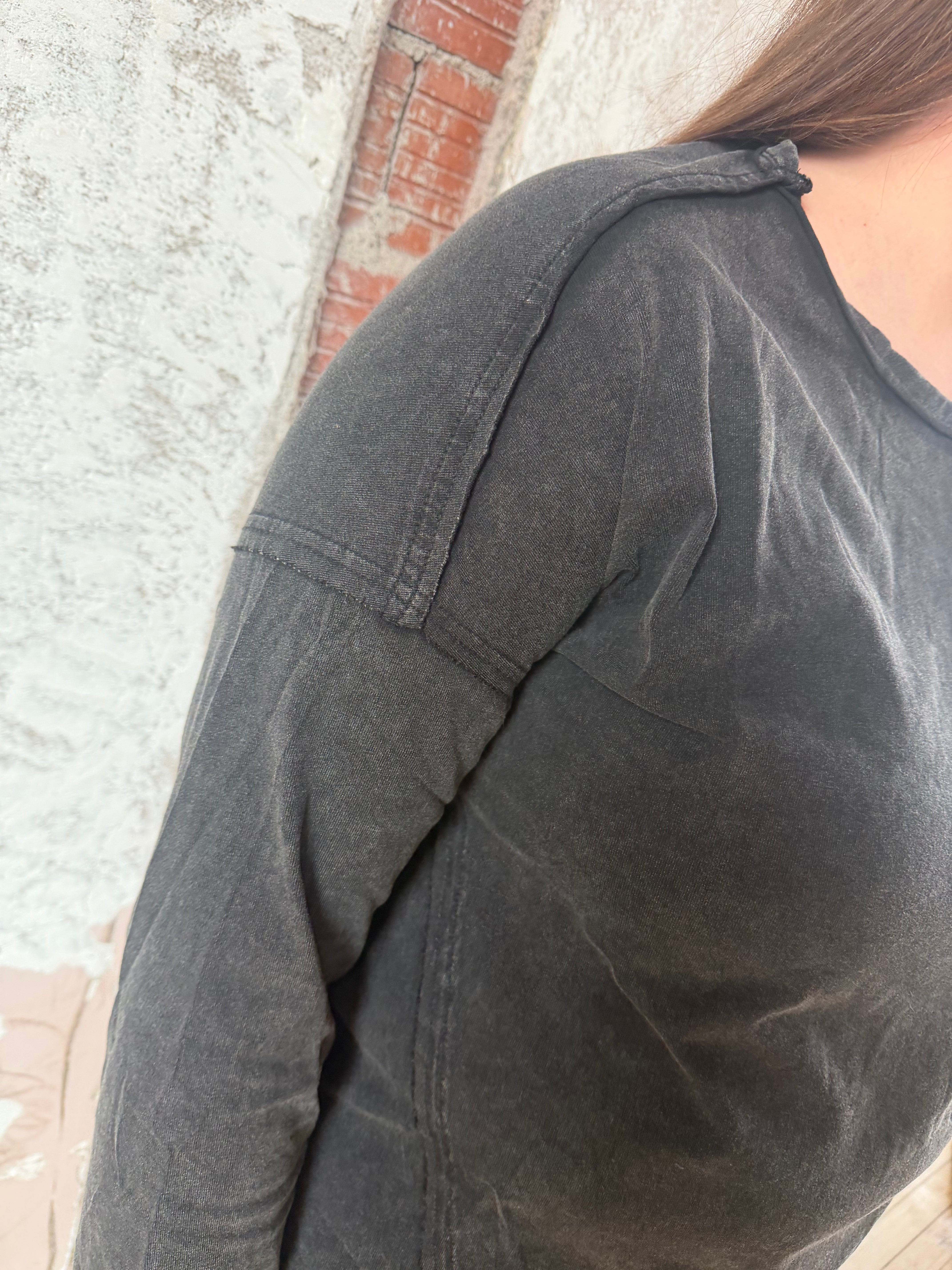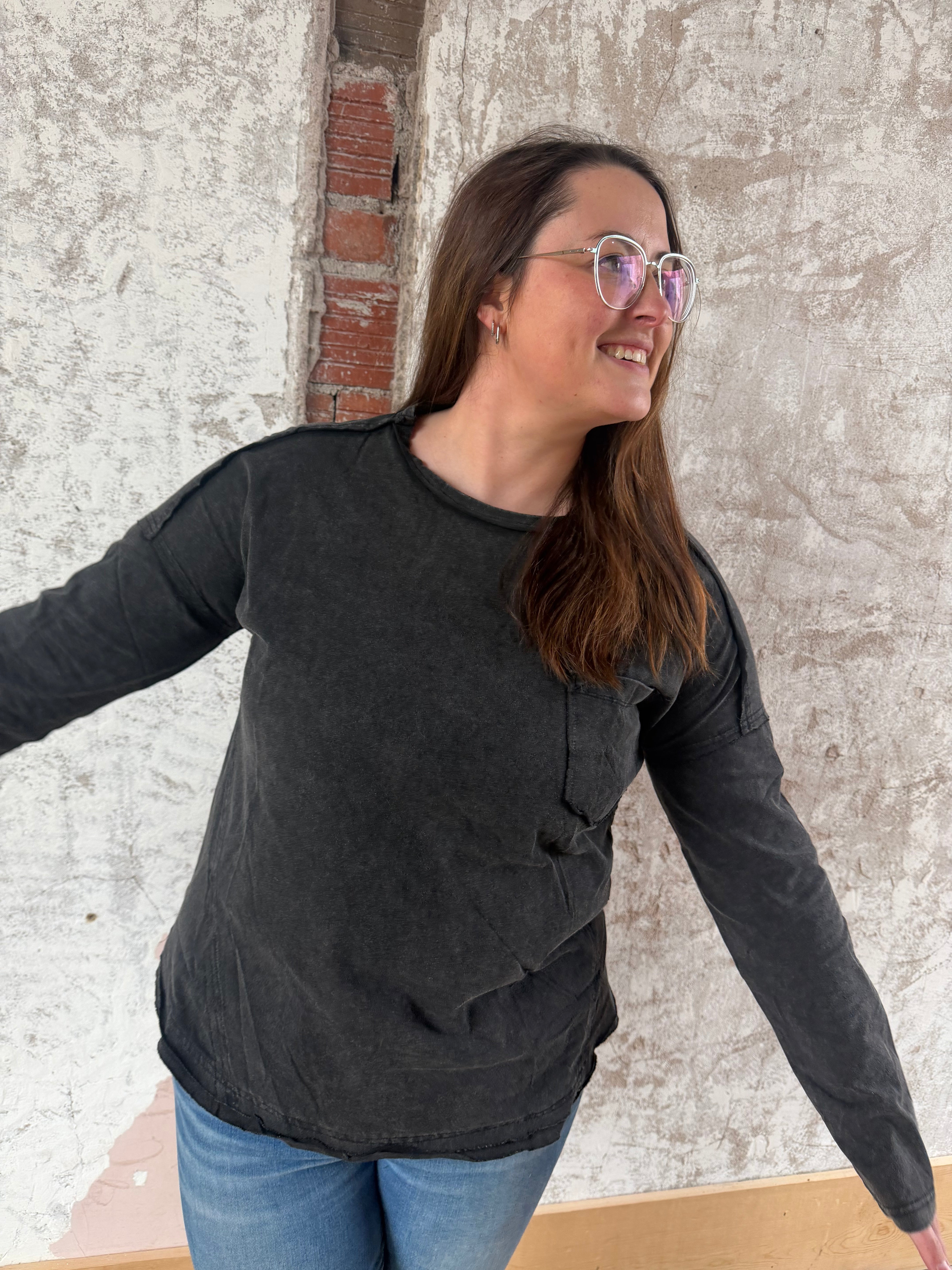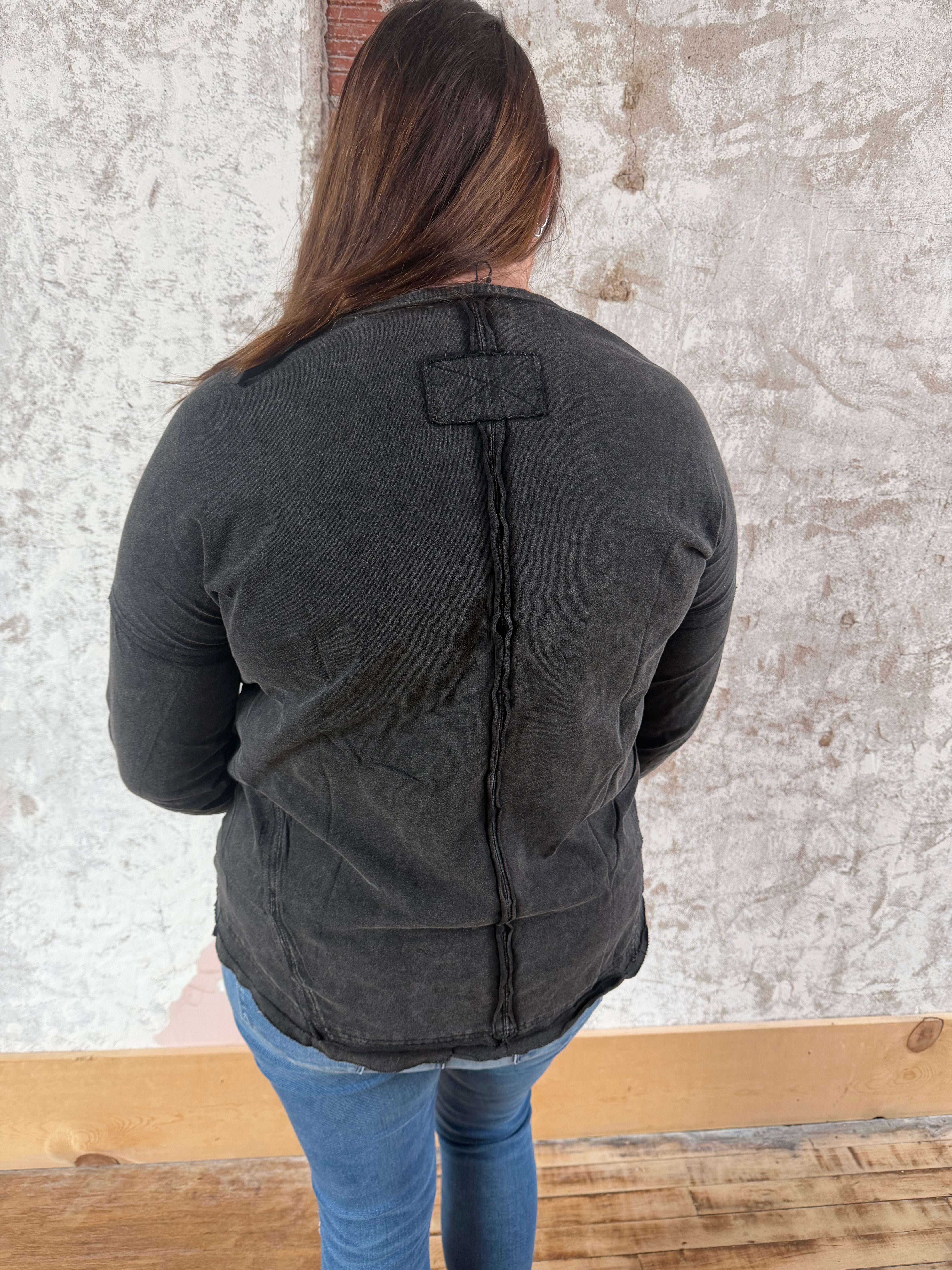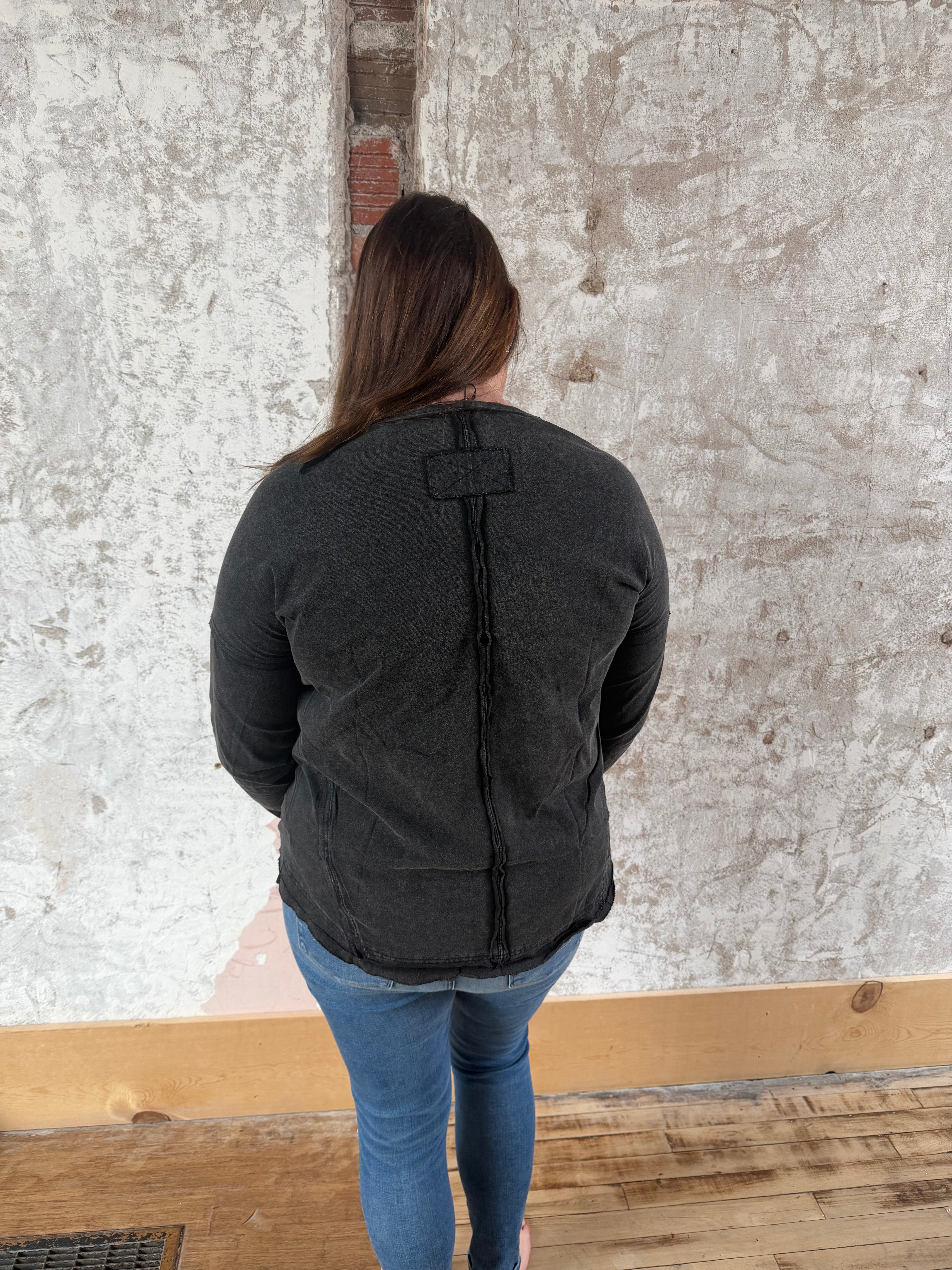 Effortlessly chic and wonderfully cozy, this mineral-washed knit top is your go-to layer for those in-between seasons. Featuring a relaxed fit, raw-edge detailing, and a handy patch pocket, it's the kind of piece that works just as well over a tee as it does solo. Long sleeves and a casual vibe make it perfect for early fall adventures—no fuss, just comfort.